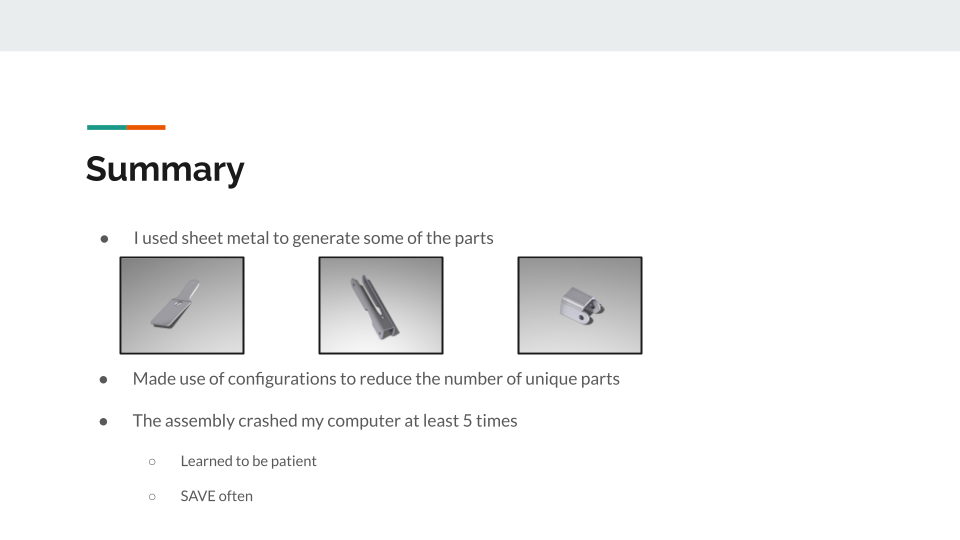 Focusing on one part at a time, and making use of the various tools available and skills I developed throughout the semester (mirroring, multiple configurations, sheet metals, complex mating, etc.) I was able to successfully reconstruct a working model of my multitool. The model is complete with drawings for each of the parts, as well as an assembly drawing.