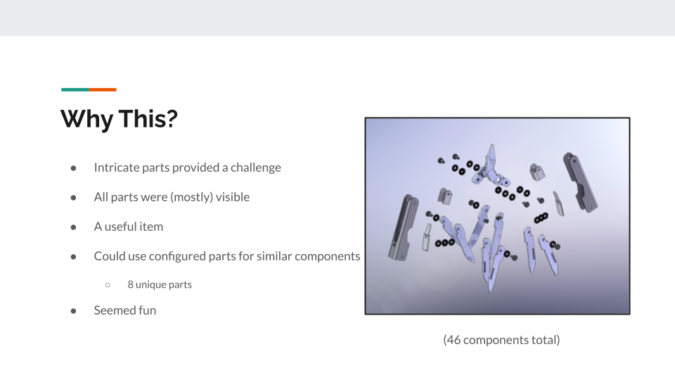 For my final project in the intro to CAD course, I needed to create a detailed 3D model of a real-world tool. I chose to recreate a multitool I had. In order to do this, I needed to disassemble the tool, record accurate measurements of each component, and re-assemble it all in SolidWorks.
