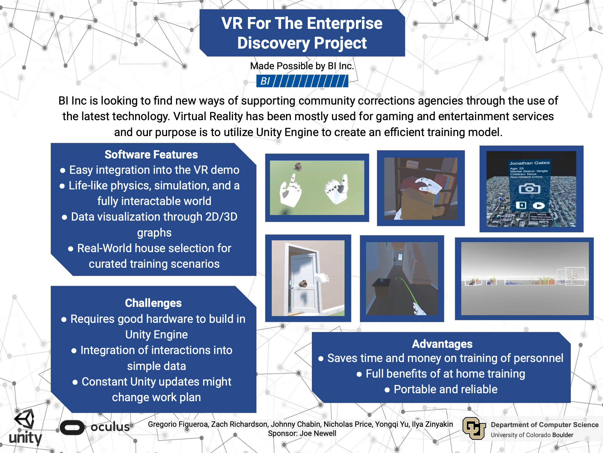During the first and second semesters of my first senior year, my Computer Science CAPSTONE course challenged me to work on a team of students to meet industry-sponsor tasks and standards in an exploratory discovery project. My team got lucky and working with BI Inc. were able to conduct a virtual reality (VR) discovery project. My team and I dove into Unity and C# to develop a physics-based house simulator in VR, and as a pipeline project, explore ways to visualize data using VR applications. I was responsible for creating the VR house world and implementing the physics and object interaction, as well as player movement and interaction controls. Overall. we were able to deliver a working demo software package that allowed the user to launch into a VR headset and explore a house with set props in it for the user to find. We also included a second demo package showcasing the different methods we found for representing data through the use of VR platforms. This project taught me the importance of having a designated leader and having continuous participation communication from team members.