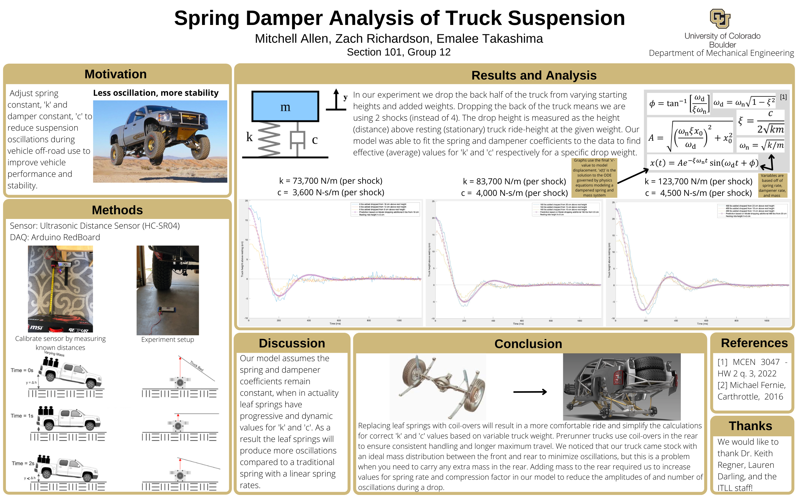 Excessive suspension oscilation is bad for stability for driving, and espessially when off-roading. We seek to understand the suspension system and minimize the oscilations by controlling added mass and measuring from various drop heights.