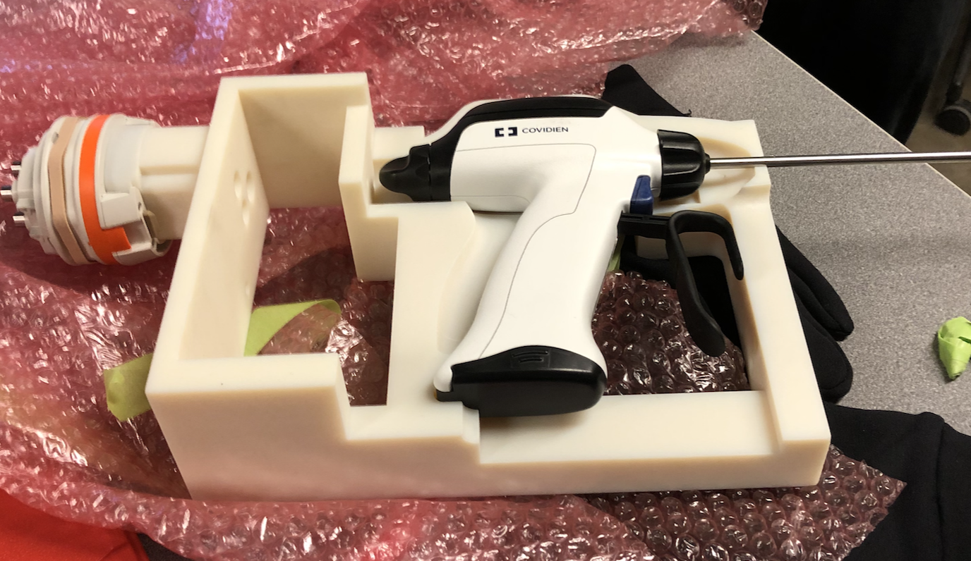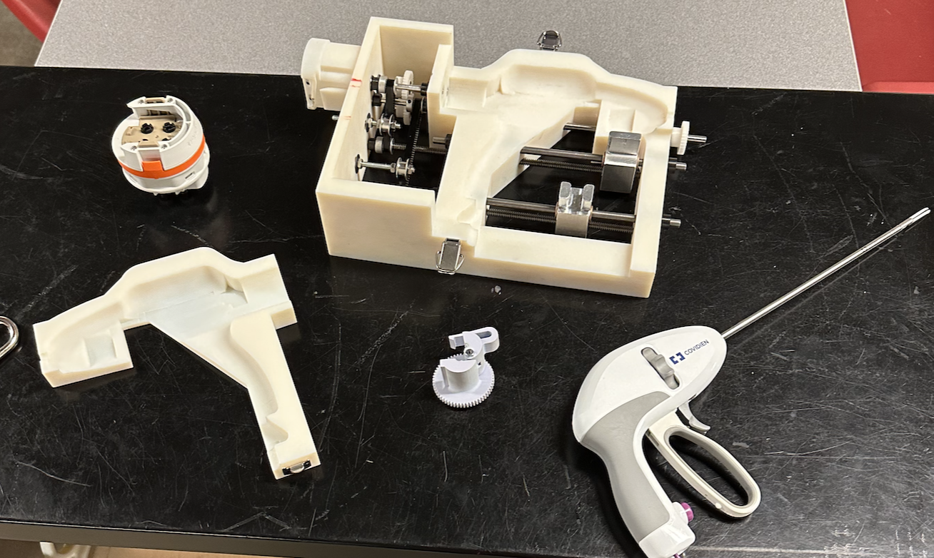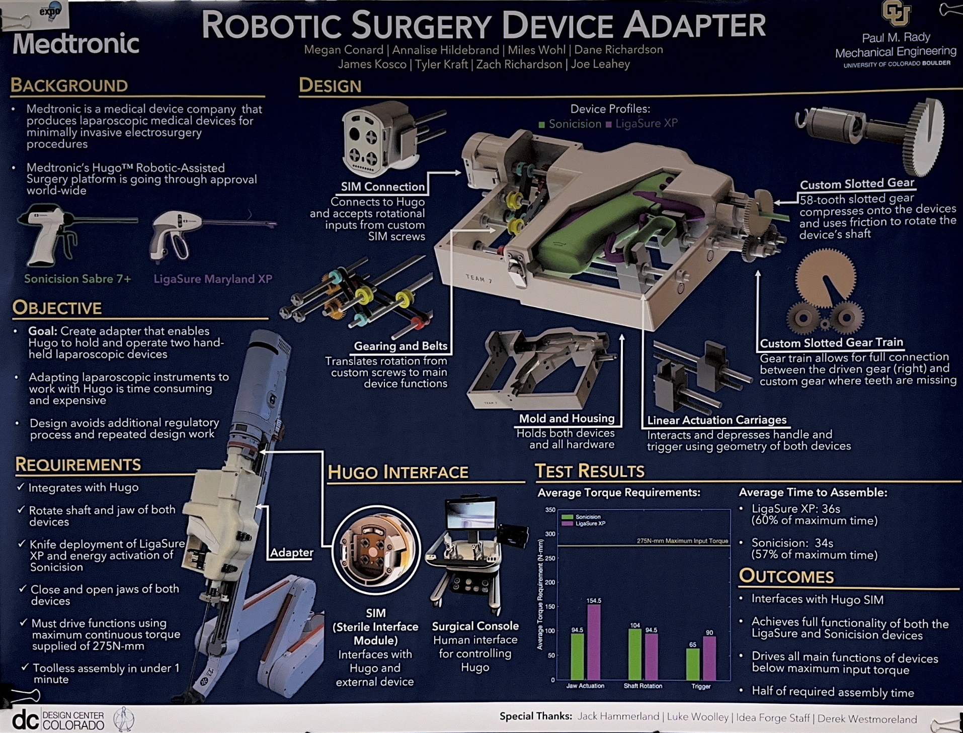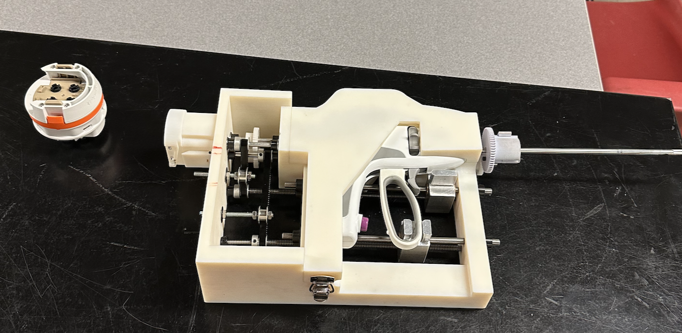 Exploratory project into developing mechanically driven solutions to hold human ergonomic tools in robotic applications, made possible by Medtronic. Our patent pending design adapts the Hugo Robottic Surgical Arm interface to pre-existing hand-held laproscopic surgical instruments.