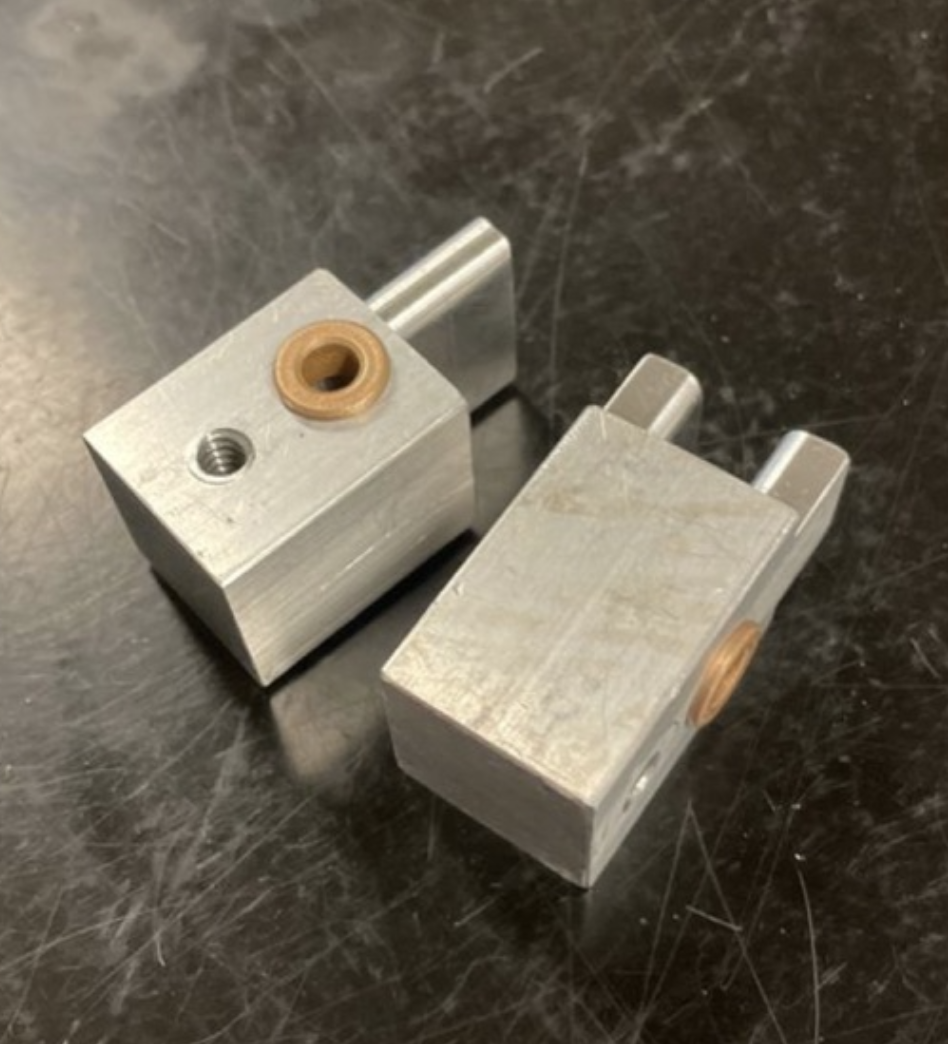 To translate rotational input to device actuation, we chose to use threaded steel lead-screws, standard off-the-shelf part, and a custom designed and manufactureed aluminum carriages that can move linearly along tthe screws and a sett of guide rods to depress the corresponding triggers and levers. The material choice again was due to aluminum's machinability and internal strengths sufficient for this application. The jaw-acttuatioin carriage in paricular was designed to be able to both push the lever closed and pull the lever open - should it become stuck in operation.