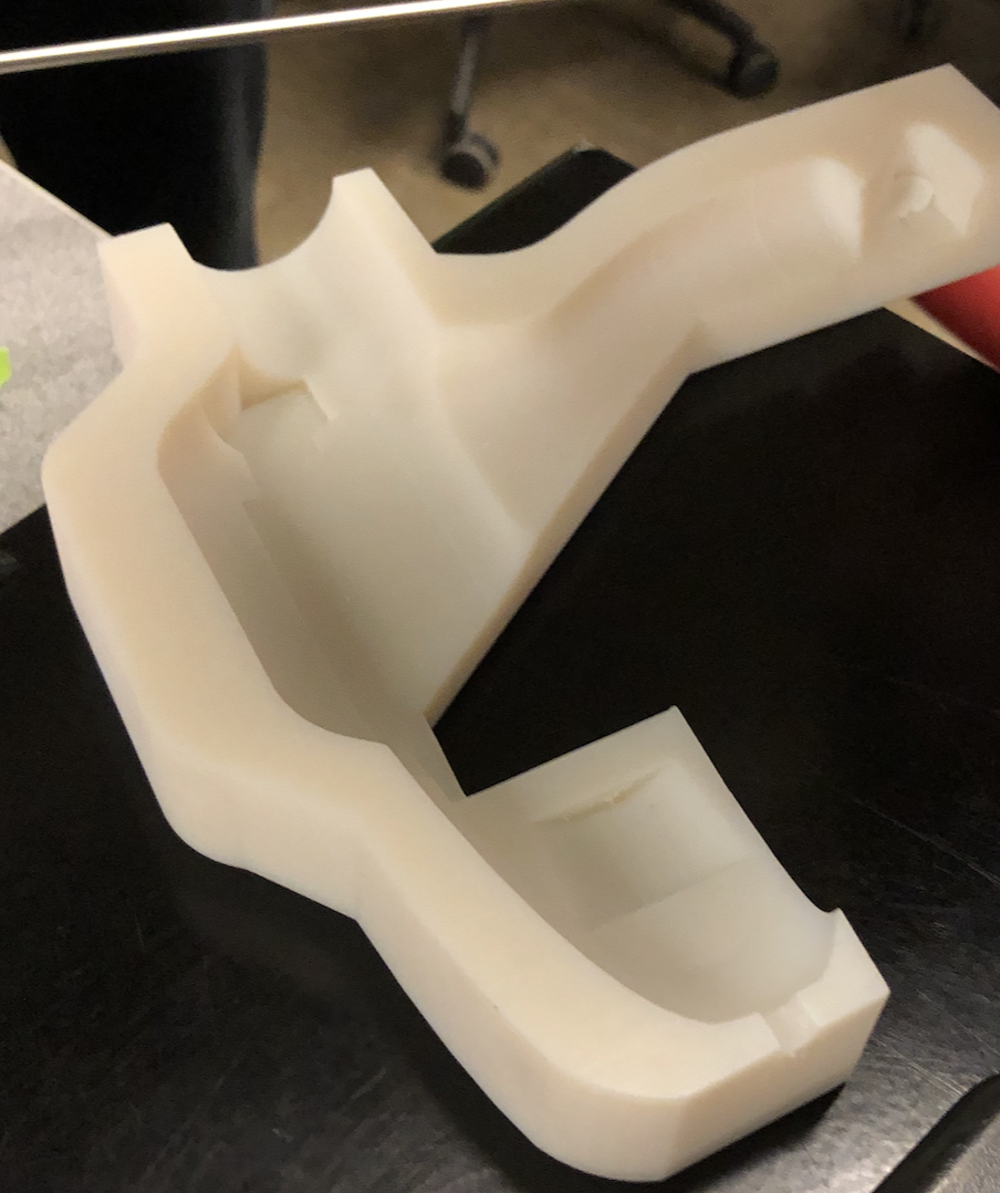By overlaying digital renderings of the two desired surgical instrumemnts, keeping their shafts concentric at the base and tip, we were able to develop a 'tool-box' like design in which we cut out deep and shallow reliefs to hold each device at separate times. The thicker device has a deeper relief cut into the molded housing, allowing for the device to be held in place keeping the shaft in position. The thinner device needed a shallower cut out of the same space as the larger device, allowing for a secondary position to be carved from the mold to hold the device in place and keep its shaft in position. Mold bottom and mold lid are pictured above. These molds were manufactured through additive layering techniques on a PolyJet printter.